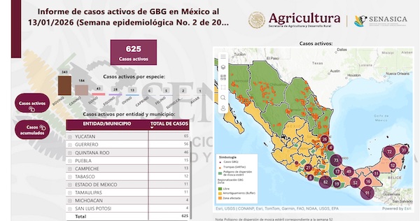 En la semana epidemiológica 2 de 2026, el Senasica indica que los casos acumulados –desde noviembre de 2024, cuando se reportó el primer caso– suman 13 mil 766, donde Chiapas concentra 5 mil 500; Oaxaca 2 mil 156; Veracruz 2 mil 028; Yucatán mil 574; Tabasco mil 095 y Campeche 693.